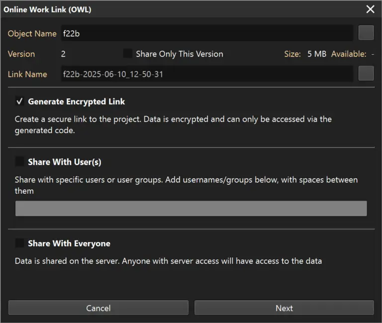 Data is compressed, encrypted and sent to the requested OWL server. Unless “Public” is selected, the server itself receives only the encrypted data, whereas the key is locally used to create the link. Without the key, the data cannot be decrypted. Shared users have the link privately encoded to them where only they, or the user, can decode the data.